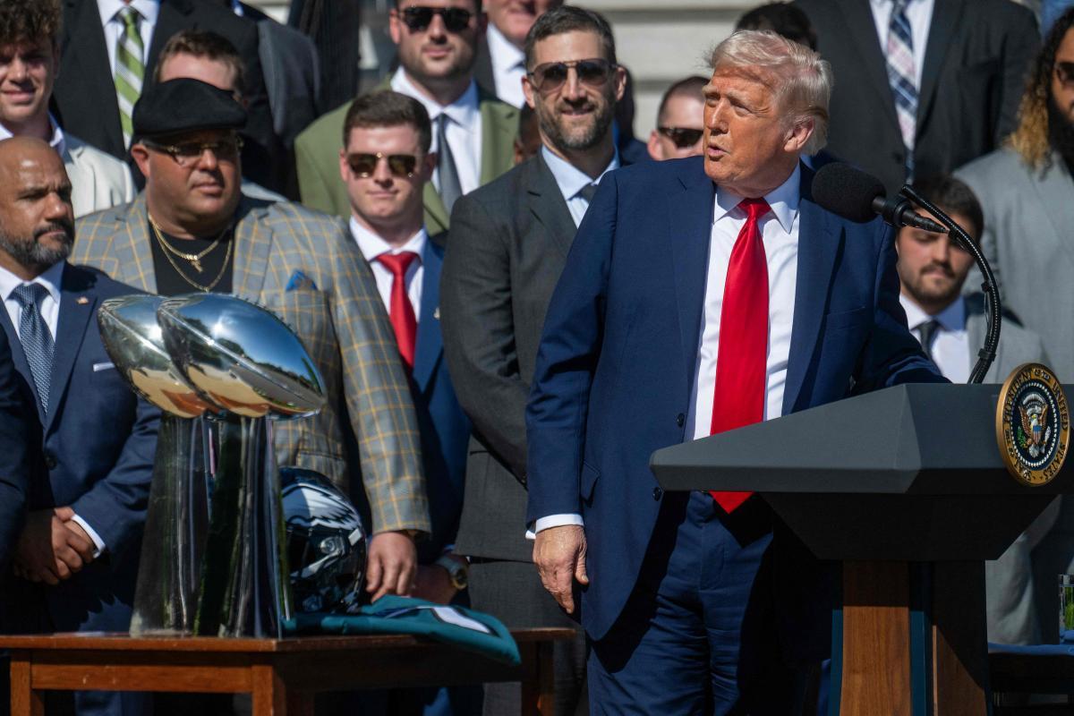 US President Donald Trump welcomed the Philadelphia Eagles football players to the White House. Trump congratulated the team on their Super Bowl victory in early February. Quarterback Jalen Hurts, the team's star, was absent from the event; he hadn't traveled to the capital.