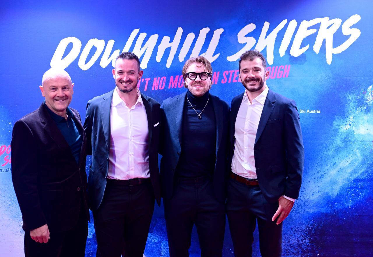 The ski stars at the film premiere, from left: Dominik Paris, Justin Murisier, Marco Odermatt, Cyprien Sarrazin, Aleksander Aamodt Kilde, and Daniel Hemetsberger. © APA / ROLAND SCHLAGER